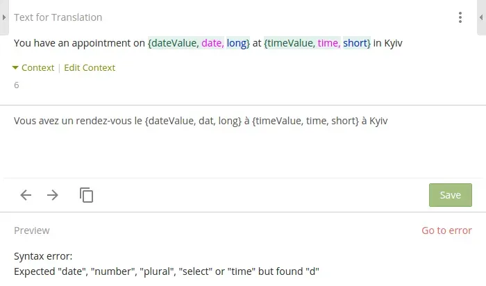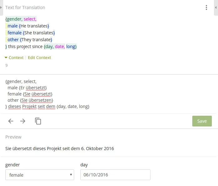 We did our best to come up with ICU syntax support and are really happy to share this amazing thing with our users! Select, Plural, Number, Date and Time formats are on hand to test and smooth away any issue one could have before.